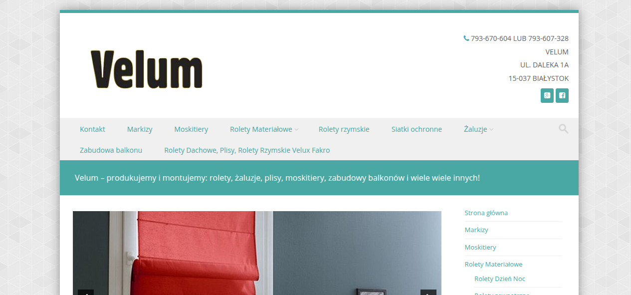 Velum to białostocka firma specjalizująca się w produkcji i montażu rolet oraz żaluzji. Oferujemy szeroką gamę produktów, takich jak rolety